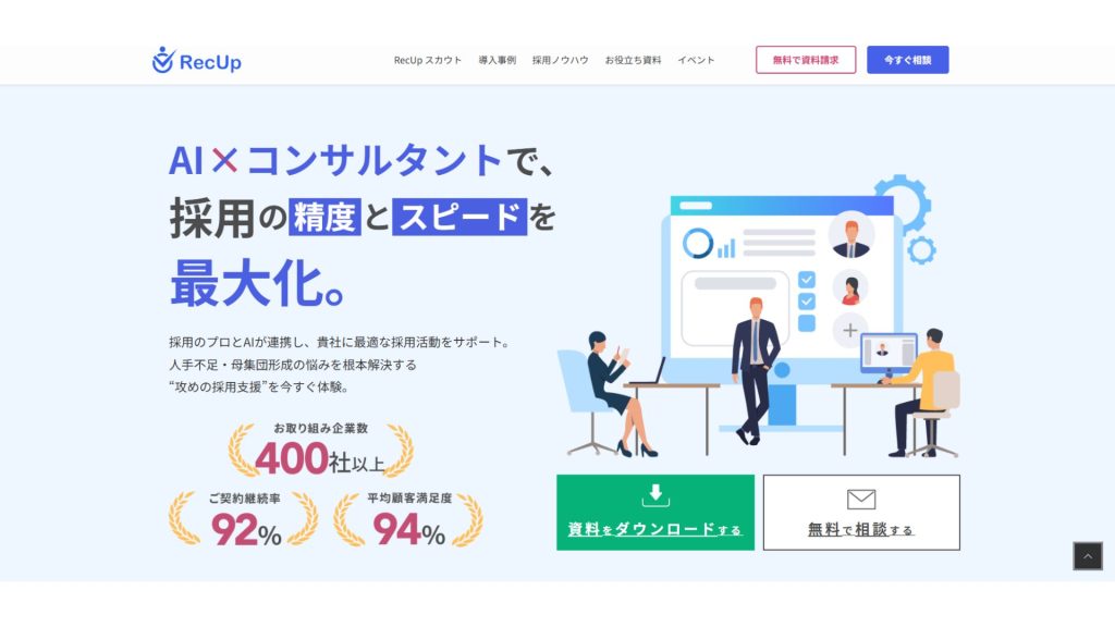 RecUpは、AIによるスカウト最適化と専門コンサルタントの伴走支援を組み合わせた、ハイブリッド型の採用支援サービスです。