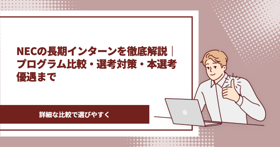 この記事では、NECグループの長期インターンの内容・待遇・選考対策・本選考優遇まで、就活生が知りたい情報をまとめて解説します。
