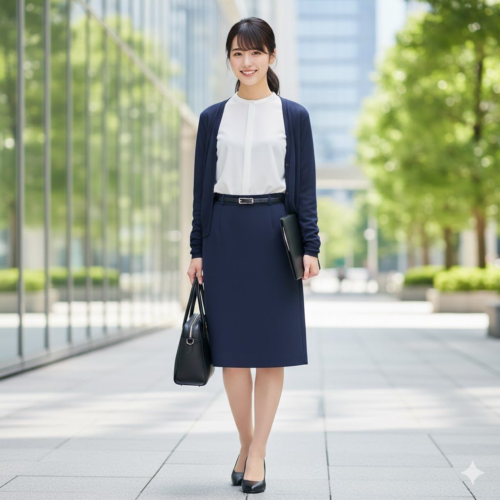 - ボトムス: 膝丈スカートかストレートパンツ。ミニ丈やマキシ丈は避けよう。